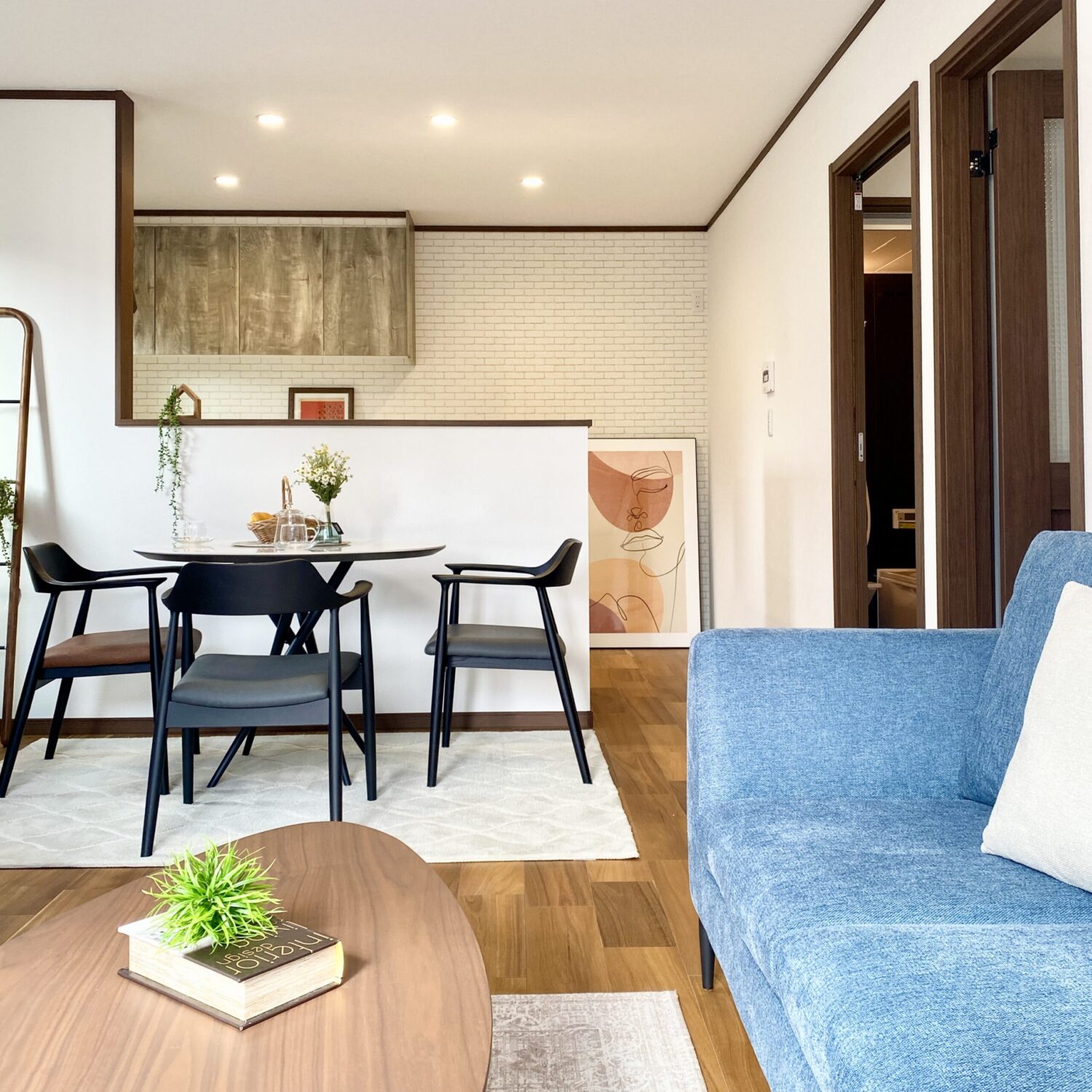 リビング・ダイニングはダークブラウンの床に合う様に、モノトーン色の食卓セットやチェストなどで